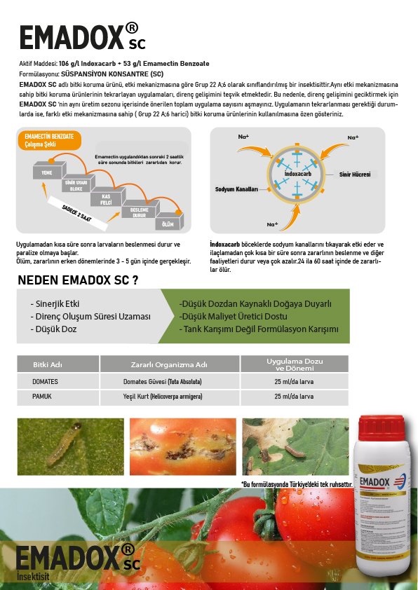 EMADOX SC adlı bitki koruma ürünü, etki mekanizmasına göre Grup 22 A;6 olarak sınıflandırılmış bir insektisittir.Aynı etki mekanizmasına sahip bitki koruma ürünlerinin tekrarlayan uygulamaları, direnç gelişimini teşvik etmektedir. Bu nedenle, direnç gelişimini geciktirmek için